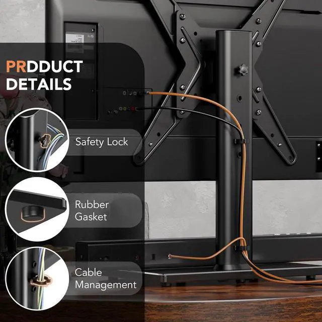 HEIGHT ADJUSTABLE FUNCTIONAL TV MOUNT My universal tv stand have 4 level height adjustment, you can hang the bracket panel on the steel bar then fix the safety screw, so it is very stability