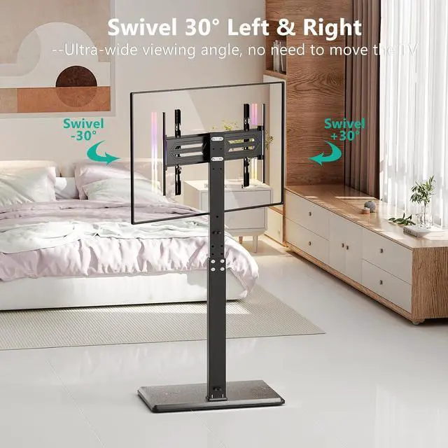 VIEWING ANGLE SWIVEL 60°: Conveniently swivel your Floor TV stand +/-30° to the right or left, allowing for easy adjustment of the screen direction and ensuring the best viewing angle from anywhere in the room
