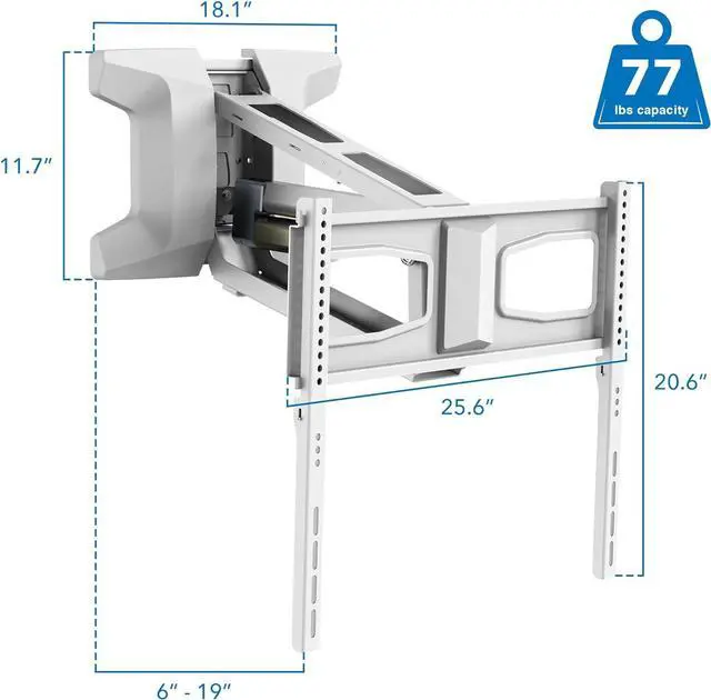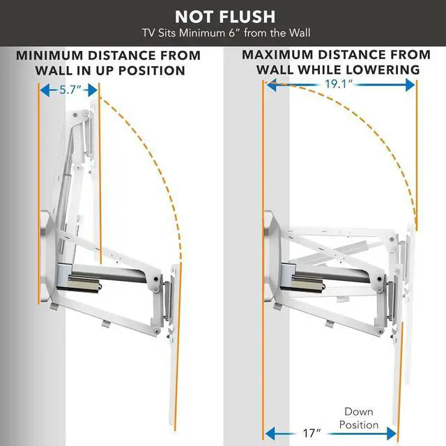 HEAVY-DUTY MOTOR: Engineered with a heavy-duty, yet silent motor, this motorized TV mount with remote raises and lowers TVs up to 77 lbs (safety tested to 154 lbs), ensuring your viewing experience is smooth and uninterrupted. It embodies the essence of a pull-down TV mount over fireplace, transforming your space into a dynamic viewing haven.