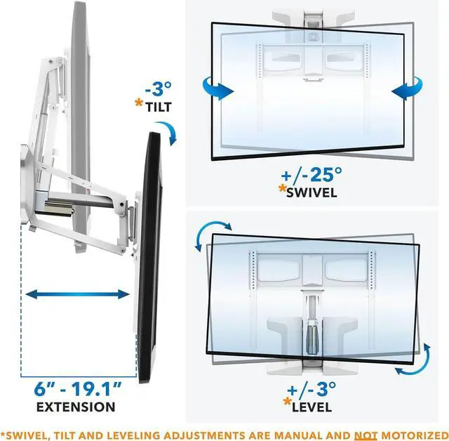 FULL MOTION: Experience full motion flexibility with a 101-degree pull angle and up to 21.3 inches of height adjustment. The manual swivel feature allows up to 25 degrees of adjustment left or right, ensuring you always have the perfect viewing angle. From electric TV mount motorized drop-down features to pull-down TV wall mount flexibility, this mount offers unparalleled control over your viewing experience, making it the ultimate choice for mantel mount enthusiasts and those seeking a top-tier fireplace pull down TV mount.