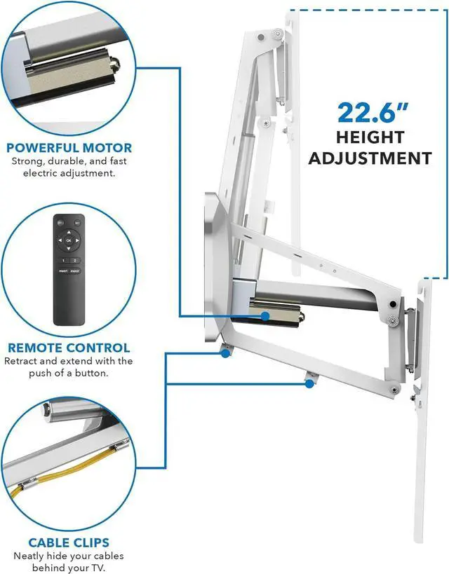 PROGRAMMABLE REMOTE CONTROL: With the programmable remote control, this mount offers the pinnacle of convenience for those lazy days or when hosting. Adjust your TVs height and angle with ease, making it the perfect companion for your living room. Its the epitome of remote TV mount technology, designed for effortless living.