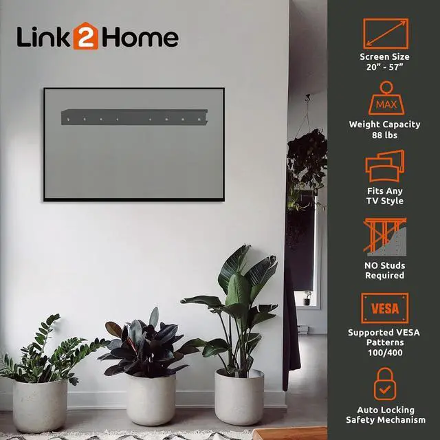 TV COMPATIBILITY: TV Bracket fits 20 to 57 screens with VESA 100x100 mm to 400x400mm mounting holes. VESA mounting patterns are the distances (in mm) between the four screw holes on the back of the TV, can hold up to 88 pounds in dry wall and 110 pounds in wood or concrete block.
