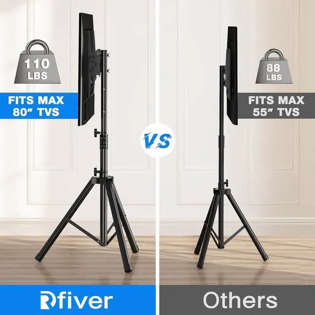 ULTRA STRONG FOLDABLE TV STAND - PROVIDE MORE SECURITY FOR YOUR TV: High-strength alloy steel material greatly increases the overall stability and load-bearing capacity; Our tripod TV stand with strong structure can securely hold up to 110 lbs; The triangular design on the base, coupled with anti-slip and anti-scratch rubber foot pads, adds stability and protects your TV; You can trust Rfiver' s foldable TV stand to protect your TV from falling