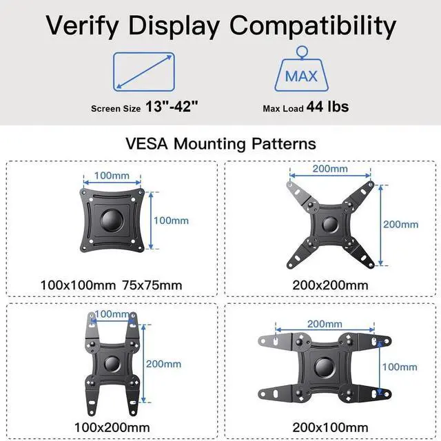 Wide Compatibility: Fits 13-42 inch flat panel TVs and monitors with mounting hole patterns of 75x75mm, 100x100mm, 100x200mm, 200x100mm, and 200x200mm, supporting up to 44 lbs.