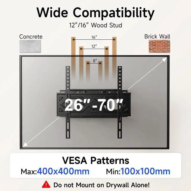 1. Universal Compatibility: Fits 26-70 inch TVs with mounting hole patterns from 100x100mm to 400x400mm, supporting up to 99 lbs.