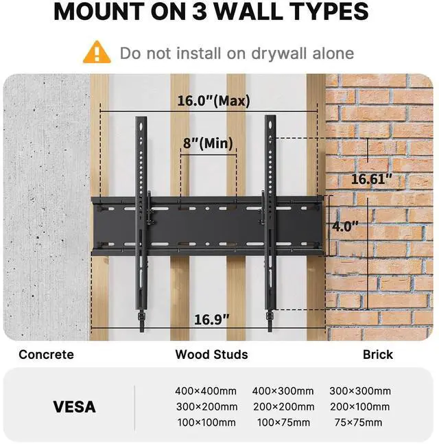 This premium TV wall mount features to tilt +7°, low-profile tilting mount holds the TV just 1.2" away from the wall ,Compatible with 8" ,12",16 wood studs, concrete, and brick wall mounting.