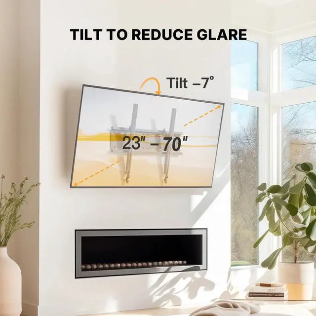 Kill Screen Glare: Tilt TV Mount Brackets offers +0/-7° on wall mounted, you can no-tool adjust your TV where you want position for abetter view, which reduceing you glare and neck/eye strain.