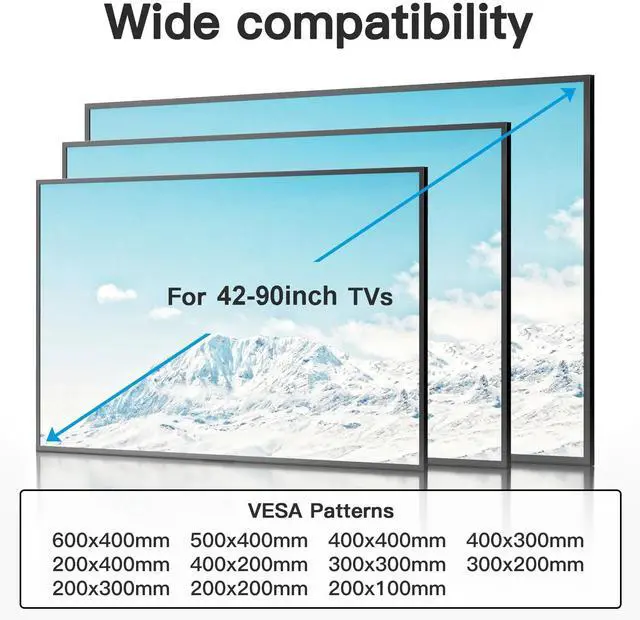 Wide Compatibility: Fits 42" to 90" TVs with mounting hole patterns from 200x100mm to 600x400mm.