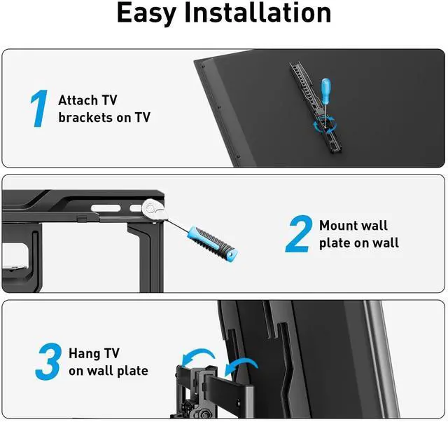 1. Wide Compatibility: The MountFTV TV wall mount bracket fits most 42-85 inch flat and curved TVs with VESA sizes from 200x100 to 600x400mm.