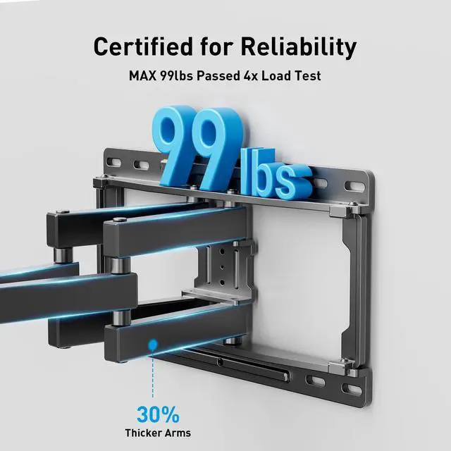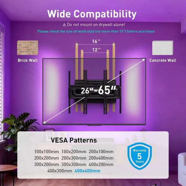 Universal Compatibility: This full motion TV wall mount accommodates 26-65 inch TVs, supporting VESA patterns from 100x100mm to 400x400mm, and safely holds up to 99 lbs (45KG).