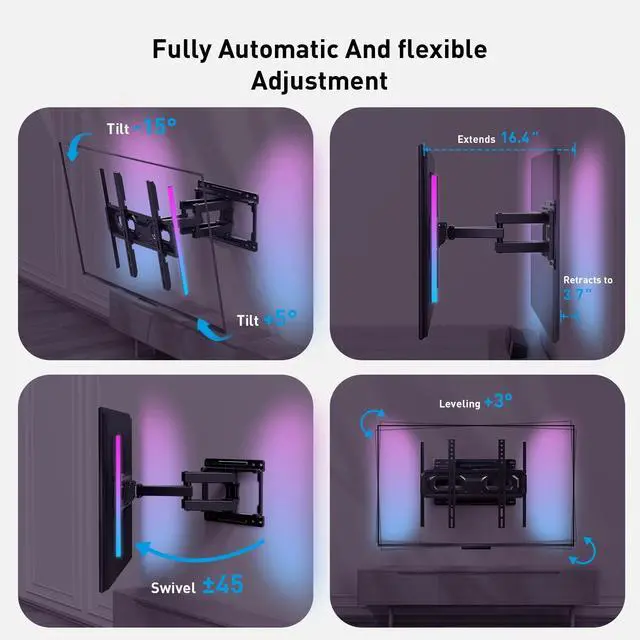 Flexible Positioning: The mount extends from 3.7 inches to 16.4 inches from the wall, providing flexible positioning and space-saving retraction for a neat appearance.