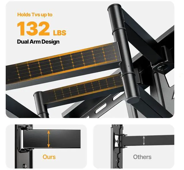 Universal Compatibility: This full motion TV wall mount fits most 37-86" flat and curved LED TVs, supporting up to 132lbs and VESA patterns from 200x100mm to 600x400mm.