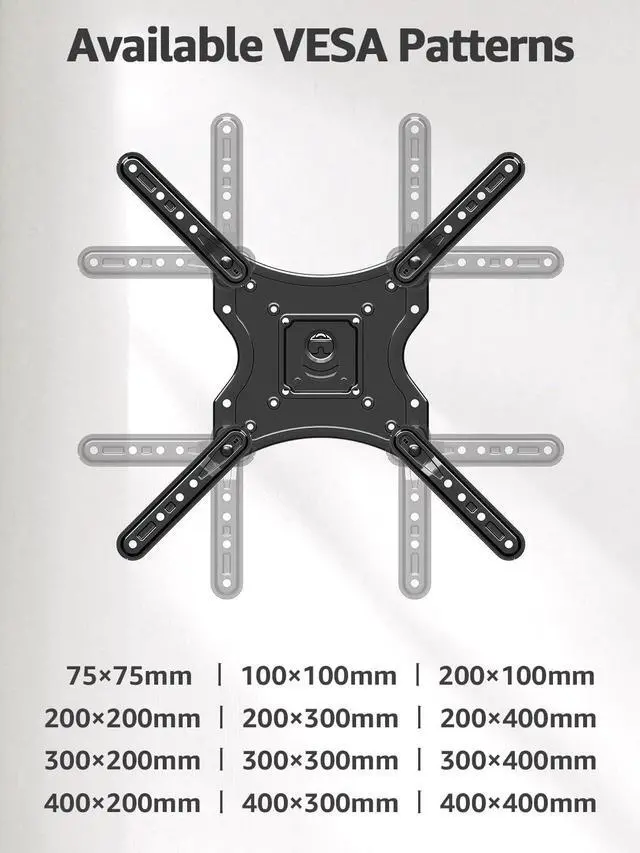 Universal TV Mount - This full motion TV mount fits most 26-60 inch TVs with vesa patterns range from 100x100mm(4x4) to 400x400mm(16x16) and holds up to 77 lbs./35kg. Please check TV weight, size, vesa, and input access before purchase.