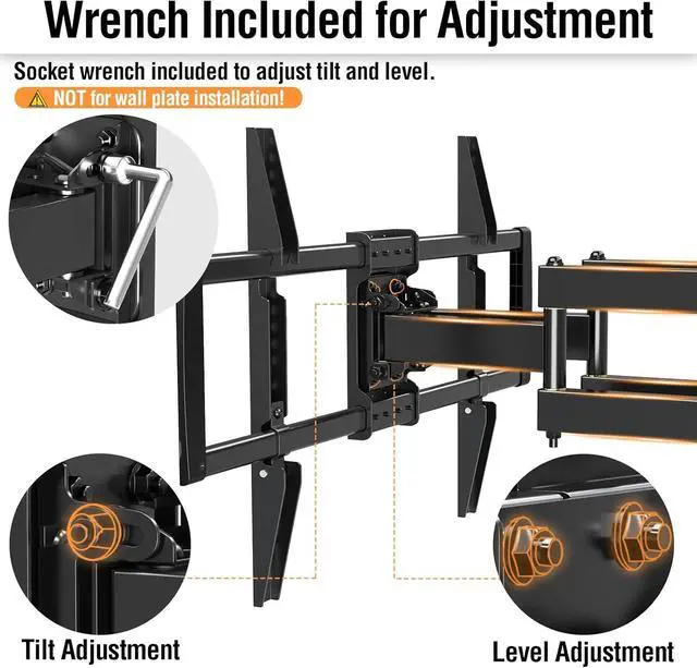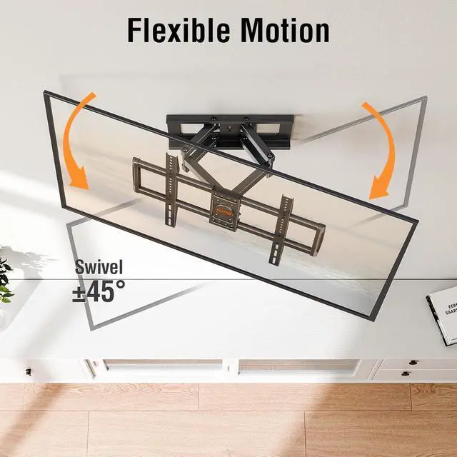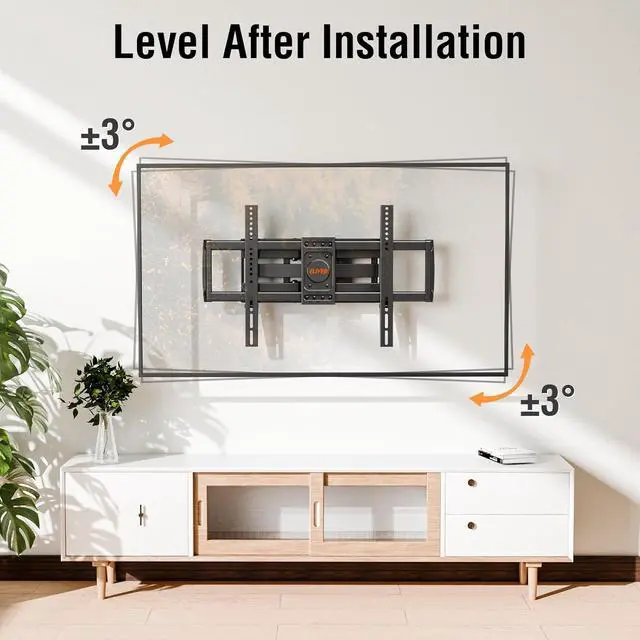 Adjustable for Best Viewing - This full motion TV mount can tilt TV +5°/-10° to reduce glare, swiveled +/-45° to cover multi-angles, level +/-3° for maximum viewing flexibility. The swivel TV mount with 6 articulating arms provides a smooth 14.1" extension and 2.3" depth to the wall.