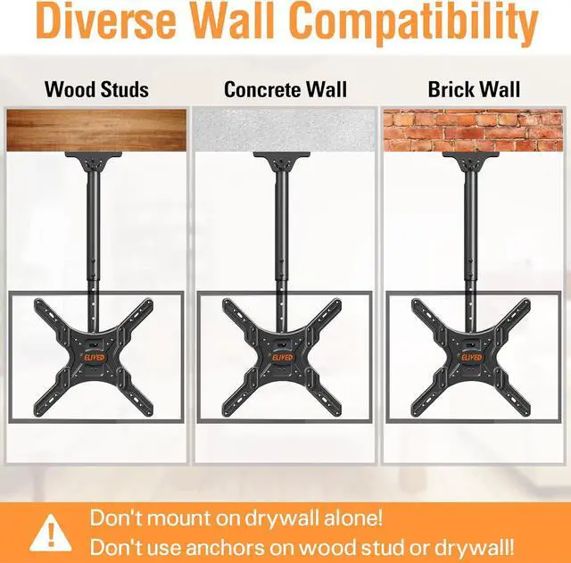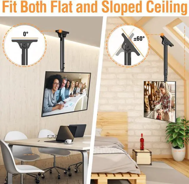 Multi-Scenes Application: ELIVED TV ceiling mount provides a nice choice for a restaurant, coffee shop, gym, grocery store, airport, shopping mall or your home. It fits both flat ceiling and sloped ceiling