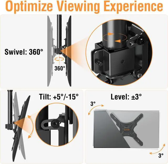 Optimize Viewing Experience: The TV mount can swivel 360°, tilt up 5°, tilt down 15°, and it has +3°/-3° screen level adjustment capability. It gives you the maximum flexibility in positioning your TV to fit your environment for a comfortable view