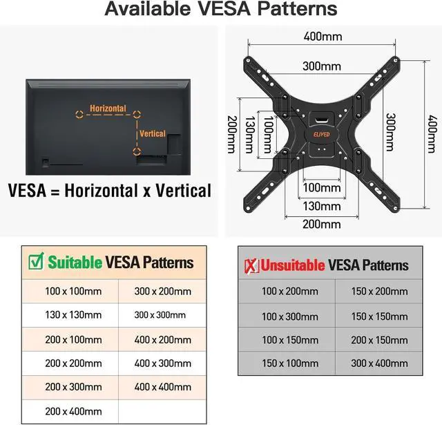 Wide Compatibility: This ceiling TV mount fits most 26-65 inch LCD, LED, OLED flat screen TVs with VESA mounting hole patterns 100x100 mm (4" x 4") to 400x400 mm (16" x 16"), holds up to 99 lbs /45 kg. Please check the TV weight, size, VESA range, and input access before purchase