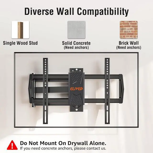 Easy Installation: TV mounting bracket comes with clear step-by-step instruction, bubble level, and necessary mounting kit for quick installation. Concrete anchors will be sent per request. Note: Do not install into drywall alone!