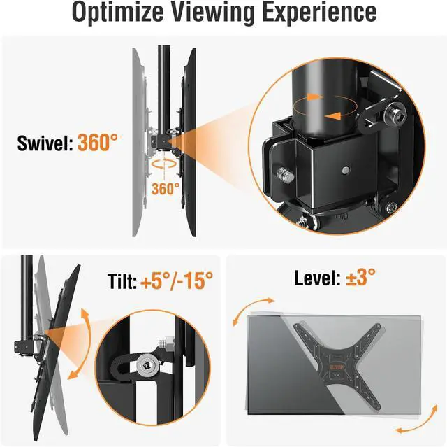 Optimize Viewing Experience: The TV mount can swivel 360°, tilt up 5°, tilt down 15°, and it has +3°/-3° screen level adjustment capability. It gives you the maximum flexibility in positioning your TV to fit your environment for a comfortable view