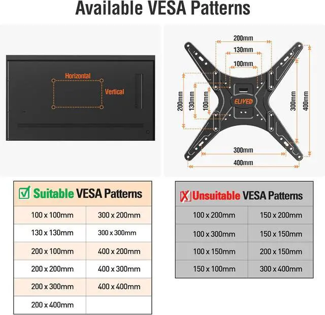 Wide Compatibility: This ceiling TV mount fits most 26-65 inch LCD, LED, OLED flat screen TVs with VESA mounting hole patterns 100x100 mm (4" x 4") to 400x400 mm (16" x 16"), holds up to 99 lbs /45 kg. Please check the TV weight, size, VESA range, and input access before purchase
