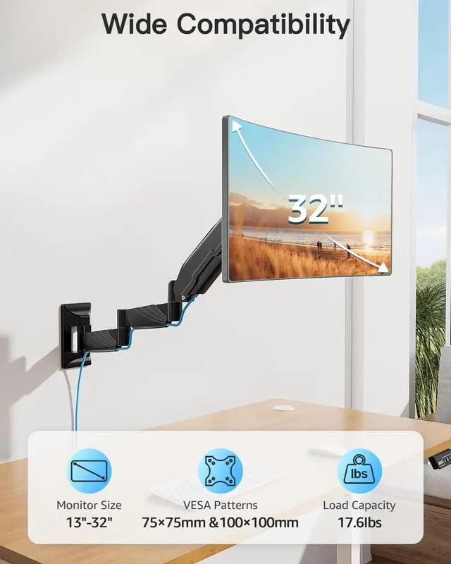 Extra-Long Arm for Maximized Desk Space - With 27.97" arm length (vs.21.6" of regular mounts), this flexible long wall mounted monitor enable flexible viewing and expanded monitor placement, freeing 50%+ desk space. Ideal for small desks, allowing room for keyboard/notebook.