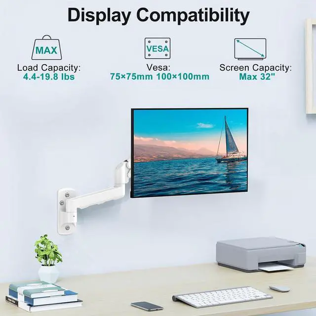 Universal Compatibility: ErgoFocus gas spring monitor wall mount provides upgraded loading capacity and can securely and easily hold monitors 13,19,21.5,22,23,24,27,32 inches and supports 4.4-19.8lbs monitors. Compatible with VESA 75x75mm and 100x100mm