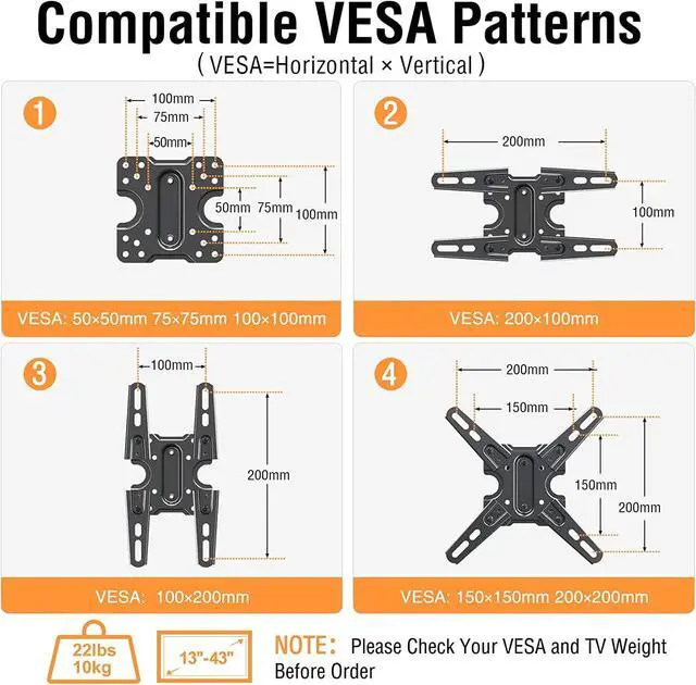 Universal Compatibility: This RV mount is compatible with most 1343 TVs, supporting VESA patterns from 75x75mm to 200x200mm. It can hold TVs weighing up to 33 lbs, making it ideal for RVs, campers, trailers, camper vans, and mobile homes