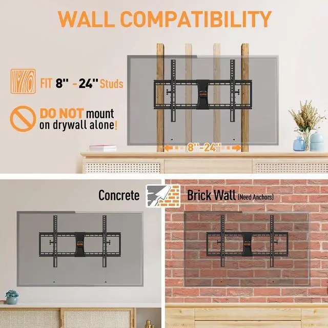 Universal TV Wall Mount - This TV mount fits most 37"-84" flat screen TVs up to 120 lbs./54.5kg, with VESA from 150x100mm(6x4") to 600x400mm(24x16"). Please check the TV size, weight, VESA, wood studs spacing, and possible blocked input before purchasing.
