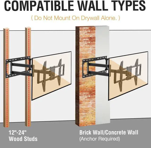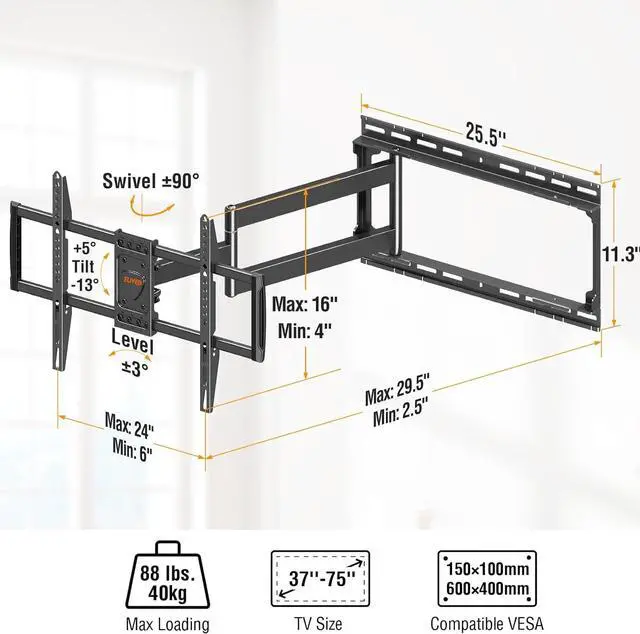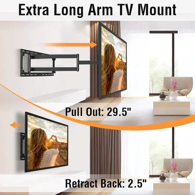 40.4 Inchs Extra Long Arm TV Wall Mount: With a 40.4 inch extension articulating arm, it provides maximum versatility and easy maneuverability.This TV Wall Mount is the perfect solution to your visibility issues.