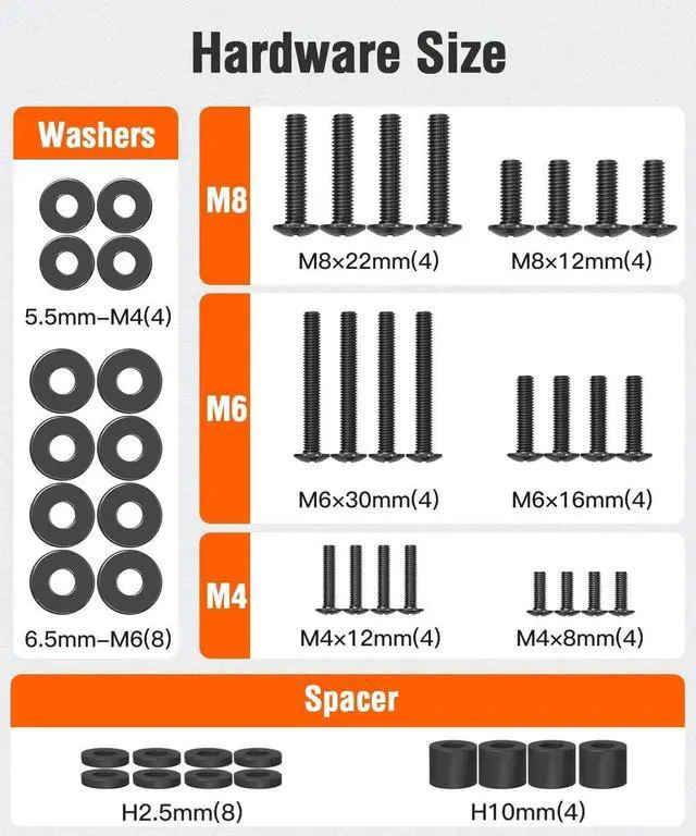 Wide Application: YD9041 hardware pack includes M4, M6, M8 screws and washers, spacers to cover most flat curved TVs/monitors from Samsung, TCL, LG, Vizio, Sony, Panasonic, Sharp, Phillips and more. Also fits all kinds of TV wall mounts, ceiling mounts, TV stands, TV carts, etc.