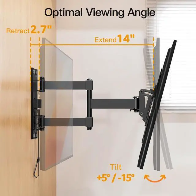 Optimal Viewing Comfort: Enjoy a perfect viewing experience with this full-motion TV mount. It tilts +5°/-15° to reduce glare, swivels +/- 90°, extends up to 14" for flexible positioning, and retracts to 2.7" to save space. The mount also allows for +/-3° leveling after installation, ensuring the ideal angle for your entertainment