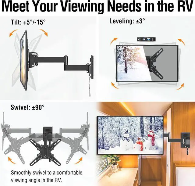 One-Step Locking RV TV Mount: This RV wall mount TV bracket with locking mechanism securely holds your TV in place and helps prevent it from moving in transit. High-strength steel ensures your TV in safe hands. Easily locked and quickly released by pulling the strap alone. A great choice for moving vehicheal