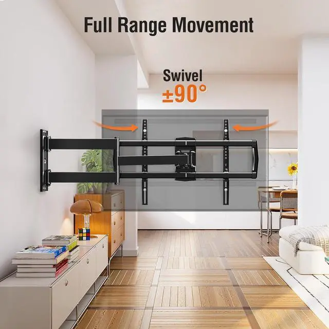 Ultimate Viewing Experience - The full motion TV wall mount can swivel left or right 90° to cover different viewing area, tilts +5°/-13° to reduce glare, and screen level+3°/-3° after installation