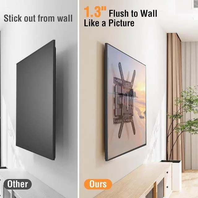 Flush Wall Design - Upgraded wall mount places TV only 1.3" against wall. Narrow the gap behind TV and save space greatly. Perfect for modern ultra thin TVs for a sleek and neat look like a picture in your living room, bedroom, office or any other places.