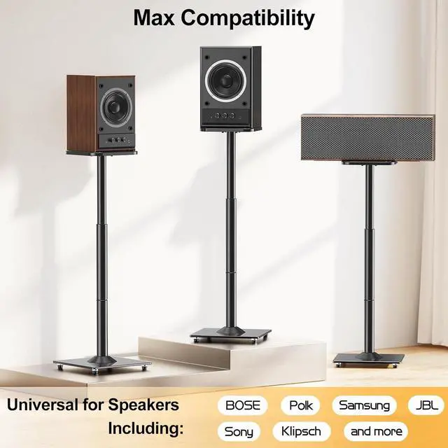 Speaker Stands - The rear speaker stands with 9.8"x9.8" plate can hold most speakers up to 22 LBS, such as the speakers from Klipsch, Sony, Yamaha, Edifier, Polk, Samsung, Bose, Vizio, JBL, Harmon Kardon and more.
