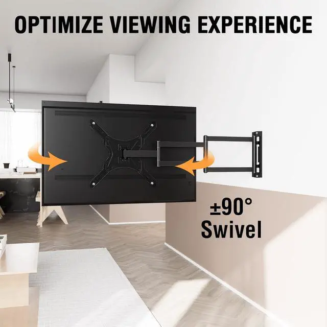 Optimize Viewing Experience - The single stud swivel design is great for wall corners. It gives you the maximum flexibility in positioning your TV to fit your environment for a comfortable view. The mount can swivel left or right 90°, tilts up 5°, tilts down 15°, and has +3°/-3° screen level adjustment capability.