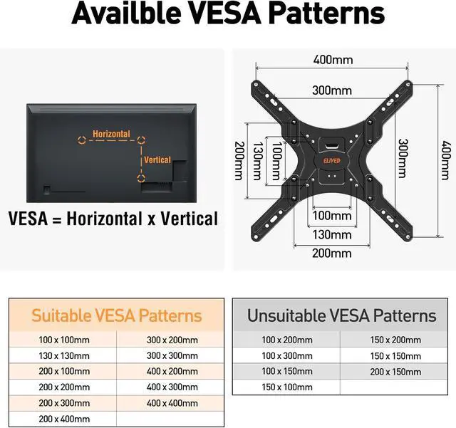 Wide Compatibility - YD3028 wall TV mount is ideal for most 42-90 inch flat and curved TVs up to 154 LBS with VESA(TV mounting holes) from 150x100mm(6x4") to 800x400mm(32x16"), fitting up to 24" wood studs spacing. Please check the TV weight, VESA, wood studs spacing and input access before purchase.