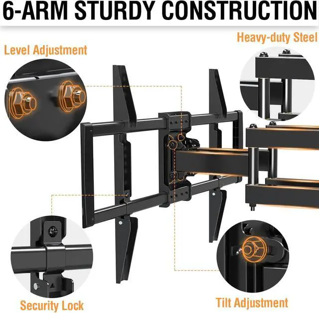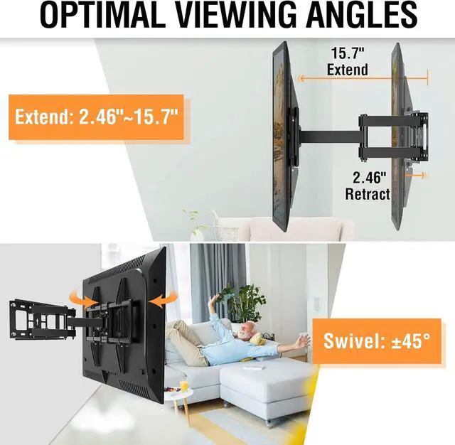 The Optimal Viewing Angle - This full motion TV mounts can swivel +/- 45° to cover more viewing position, tilt the TV backward +5° and forward -13° to reduce screen glare. The articulating TV mount can extend up to 15.7" and retracts back to 2.46" for maximum flexibility. You can level the TV screen +/-3° after to get straight on the screen.