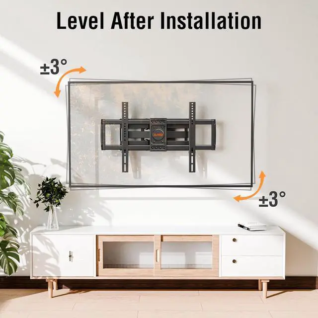 Optimal Viewing Angle - Wall TV mount can swivel +/-45° to cover more viewing positions, tilt +5/-13° to reduce screen glare and neck pain, level the screen +/-3° after installation. Come with wrench to easily adjust the tilt and level screws. Note: The wrench provided is NOT for lag bolts of wall installation.