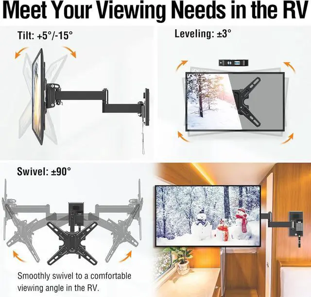 Optimised Viewing Experience: This full motion TV mount for RV tilts +5°/-15° to reduce screen glare, and allows +/-3° level adjustment and +/-90° swivel for better viewing experience. Articulating RV mount extends out to 14.09" from the wall and retract back to 3.15" for space saving.
