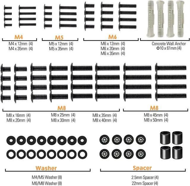 TV Screws Kit In One Pack: YD1013 Hardware Kit includes each part you need to assemble your TV/monitor to a wall mount or stand. The kit set comes with M4, M5, M6, and M8 screws, washers, spacers, and concrete wall anchors for most TV/monitor mounting.