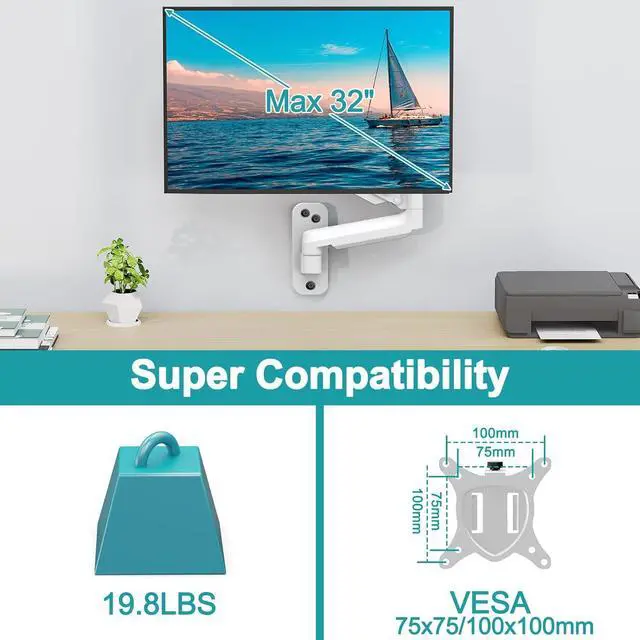Wide Compatibility - This computer monitor wall mount widely fits 13 - 32 Inch computer Screens with VESA pattern 75x75mm and 100x100mm, not limited to 32 30 28 27 25 24 23 22 21 20 19 17 inch screen, but not compatible with 1000R/1500R/1800R curved screens, and supports 4.4-19.8lbs monitors.