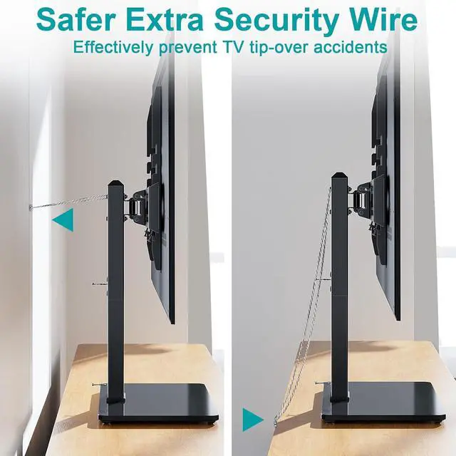STABILITY AND SAFETY - The whole mount structure is made from heavy-duty steel materials, together with the high-quality tempered glass base, provides a stable and safe holding for your TV; The safety lock screw prevents the TV from falling off and the glass base has 4 rubber pads to avoid skidding.