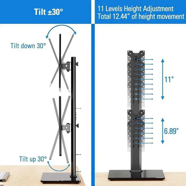 Articulation & Height Adjustment - The double monitor stand comes with a sturdy free-standing base which makes it conveniently portable. The monitors can be tilted 30° up or down, swiveled 45° right or left, and rotated 360° for maximum viewing comfort. 11 different positions and a total of 12.44 of height movement along the pole are perfect for the monitor it was needed for.