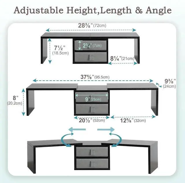 Adjustable Length and AngleCustomize the shelf to your exact needs with its adjustable length (ranging from 28.34 inches to 37.6 inches) and angle (adjustable up to ±90°). Whether you need a wide surface or a specific angle for your monitor, this shelf adapts to fit your unique setup.