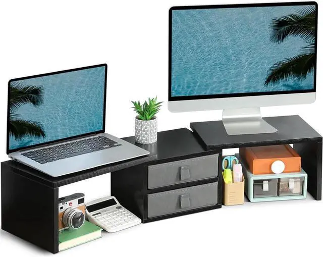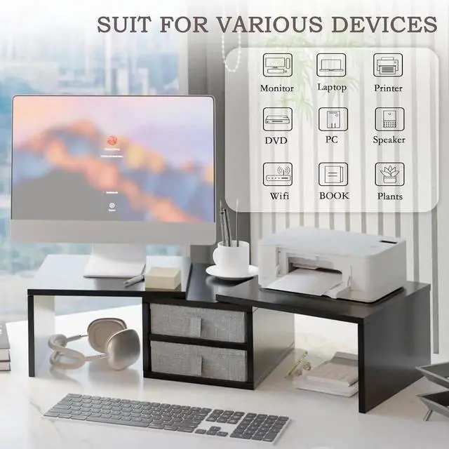 Versatile Stand for 2 DevicesDual monitor stands for 2 monitors, laptops, printers, computers. This 3 shelf desk shelf is designed to accommodate all your office equipment. Its versatile design ensures it fits your workspace, making it an helper for your home and office.