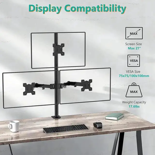 Compatibility: Fits most flat panel monitor up to 27 and supports weight up to 22lbs per arm. Mount plates detachable and height adjustable applicable to mounting holes 75x75mm and 100x100mm.