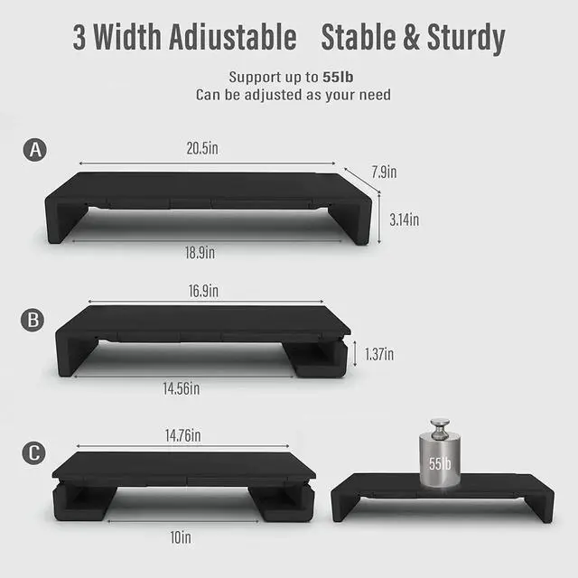 3-Length Adjustable & Foldable Stand WideThis monitor stand riser is adjustable and 3 kinds of width- 16.5 inch, 18.5 inch and 20.5 inch. you can adjust it' s width as you want, suitable for different monitors, and when you want to elevate the monitor height.