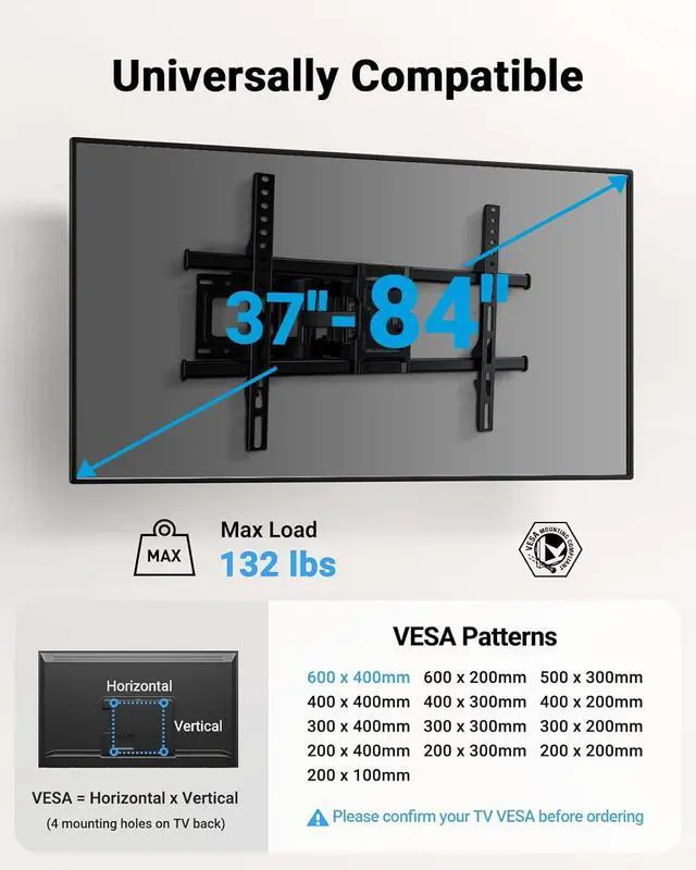 Pipishell Full Motion TV Wall Mount for Most 37-84 Inch TVs up to 132lbs, Wall Mount TV Bracket Articulating Swivel Tilt Extension Leveling Max VESA 600x400mm Fits 12/16" Wood Stud, PILFK1