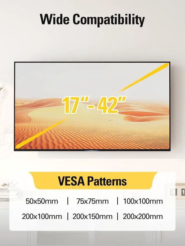 [Universal TV Wall Mount] Fixed TV wall mount fit most 42-84'' TVs, like general 43, 50, 55, 65, 70, 75, 80 flat screen or curved TV up to 132 LBS. Flat TV mount fixed on wall is designed for TV VESA/mounting hole spacing of 600x400mm/500x300mm/400x400mm/400x300mm/400x200mm/300x300mm/200x300mm/300x200mm/200x200mm/200x100mm. TV wall bracket work for most LED OLED LCD, like Samsung/LG/TCL/Sony/Vizio/Hisense etc. large screen TV. TV mount bracket fit 16, 18", 24" wood stud and brick/concrete wall.